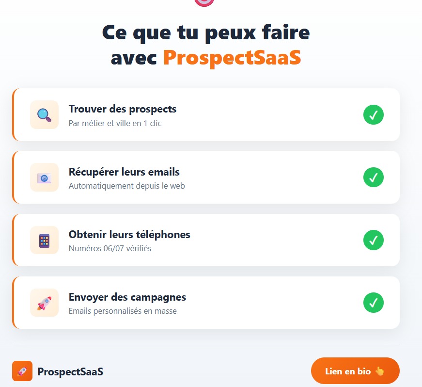 Plutôt que des milliers de leads difficiles à exploiter, ProspectSaaS privilégie une prospection structurée, actionnable et immédiatement utilisable.